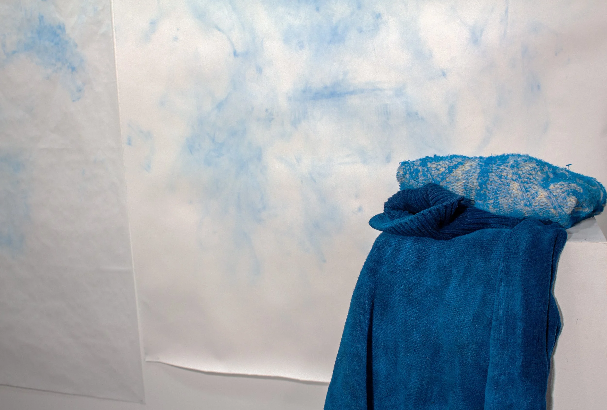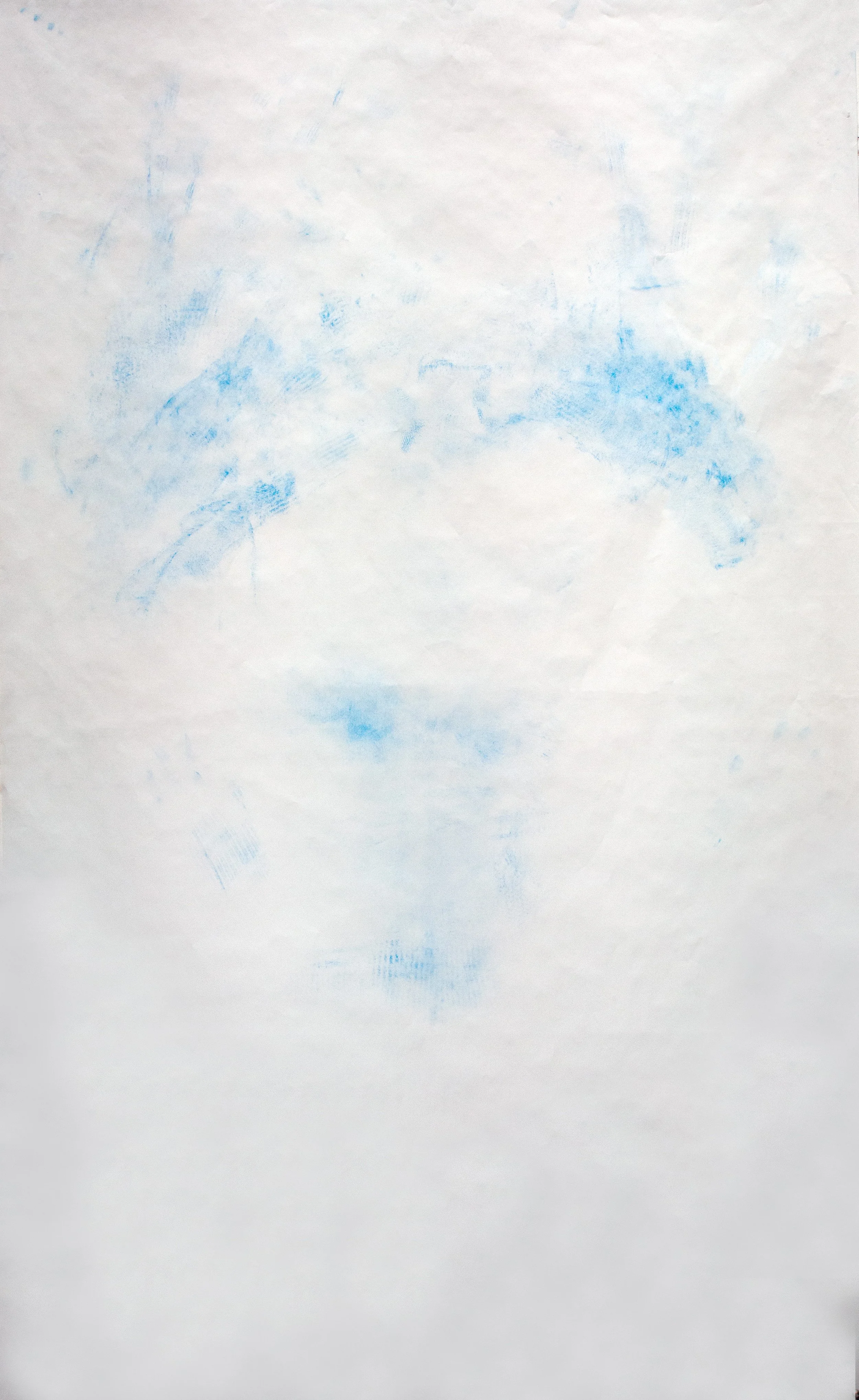 My drawings examine the idea of subjectivity through the metaphysical interconnectedness of female subjects represented by the reflected and extended physical bodies. To Gunther Kress's quote “the medium of inscription changes the text”, my recent research on materiality and the medium is presented through my oil pastel drawing Twenty-One (2023). Familiarized with traditional Chinese calligraphy which uses a wool brush, I extend the material of the wool from a brush into a sweater. By coloring the Forever 21 white wool sweater blue and wearing it, I repeatedly threw my twenty-one-year-old body as brushstrokes onto the paper and presented an embodiment within the materiality. The piece is an adaptation of Julio Cortazar's essay "Don't Blame Anyone" in expressing one's entanglement and impasse by the reality that one contrived and enforced on one's initiative. Twenty-One functions as my challenge to Yves Klein's Anthropometry of the Blue Period (1960). By opposing Klein's misogynist approach of using naked female bodies as a white male artist, I assert a feminist attitude with my active female body clothed with a sweater. Blue refers to detachment in Buddhism, and this piece also documents my effort in confronting my mental struggle for the entire twenty-one-year-old that feels a bit distant as I turned twenty-two a month after this piece was completed.